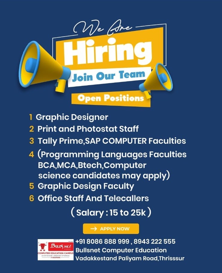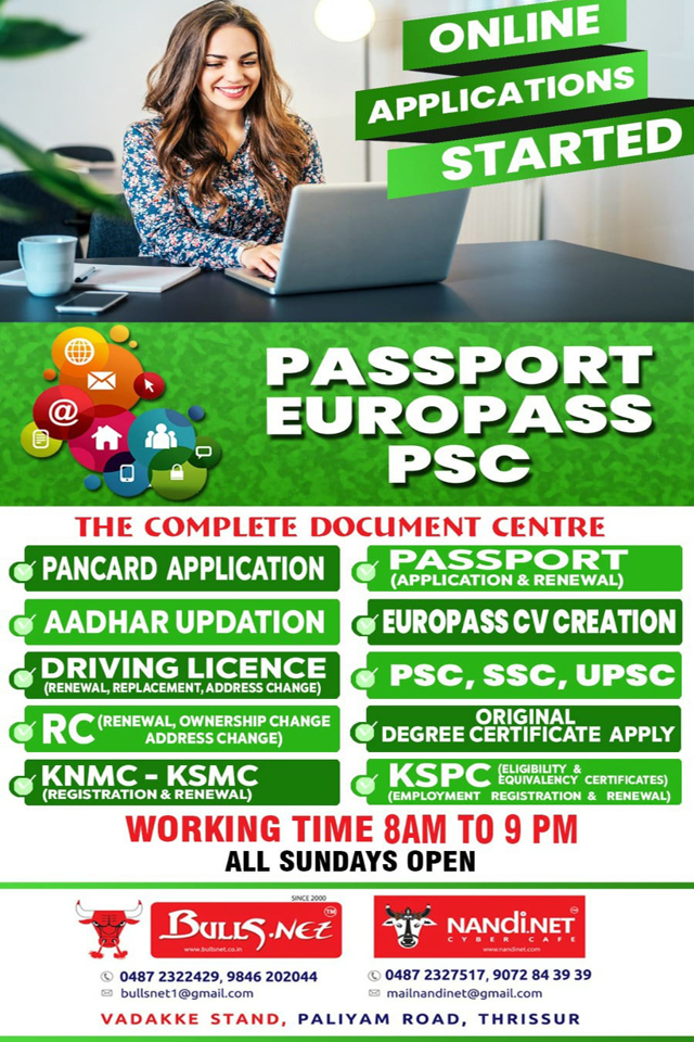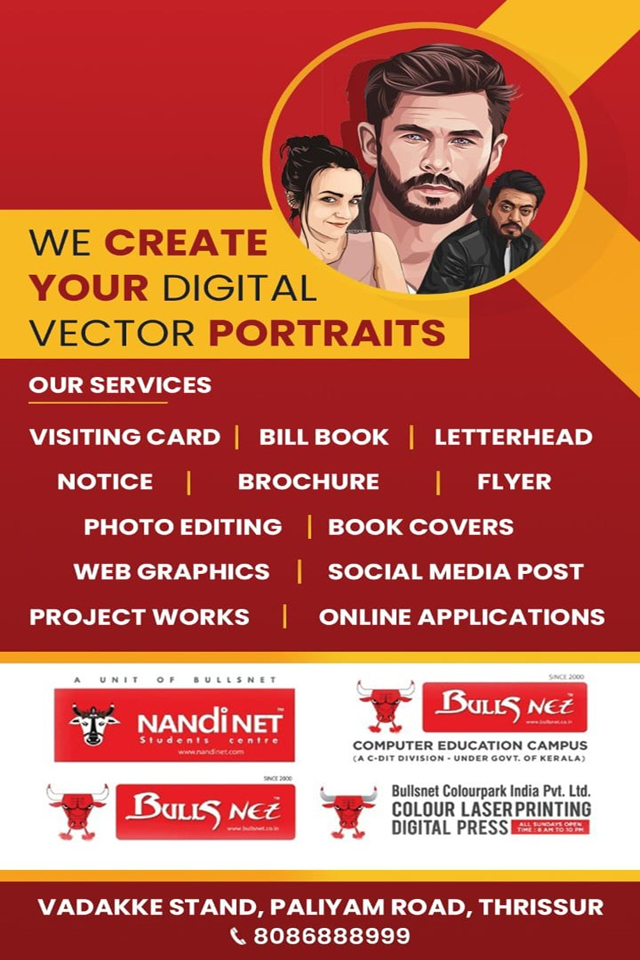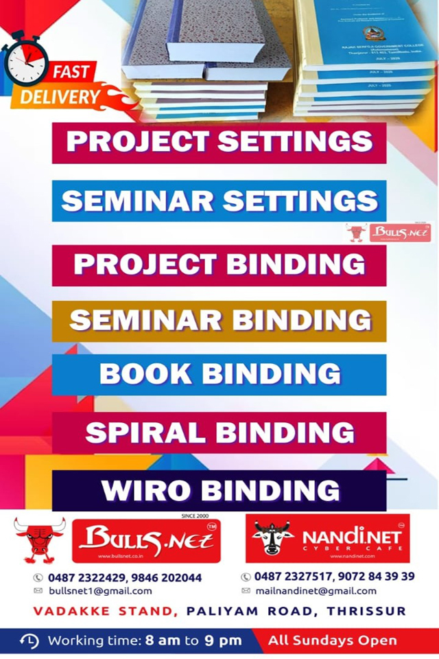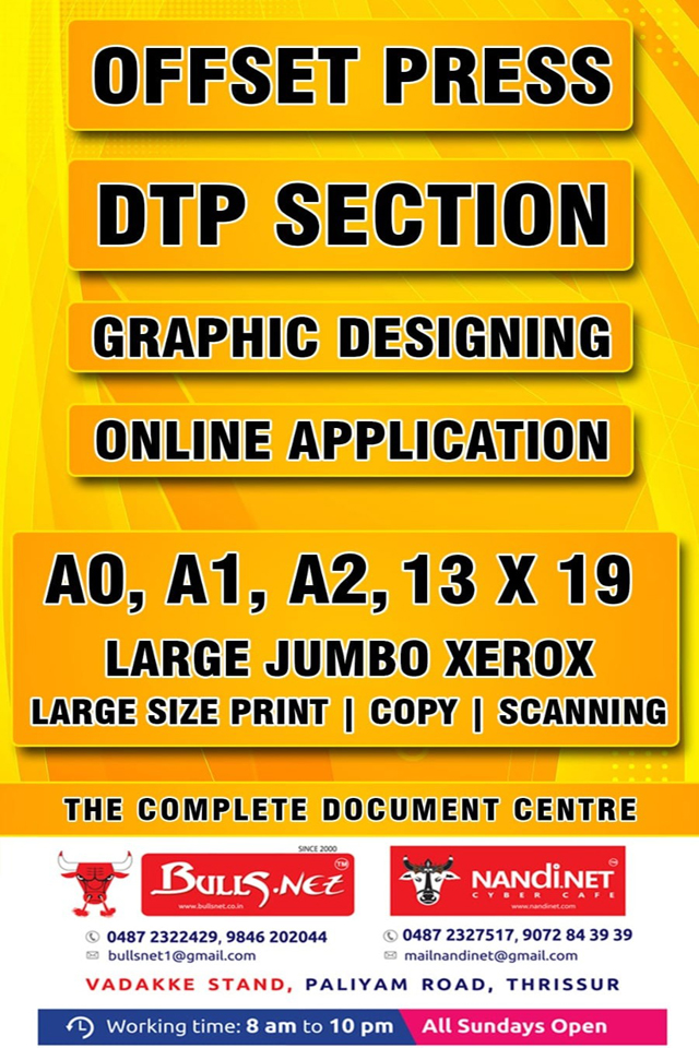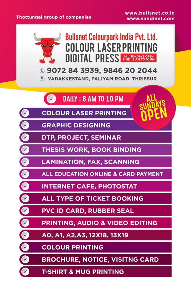 BULLSNET, The finest Graphic Designing, Project and Online Services Centre in Thrissur of the best in class services to the customers since 2000. We offer high speed internet connectivity. Our well experienced and highly qualified staff offers the best service in fulfilling customer’s needs. Our working time from 8AM to 10PM at night and Sundays.